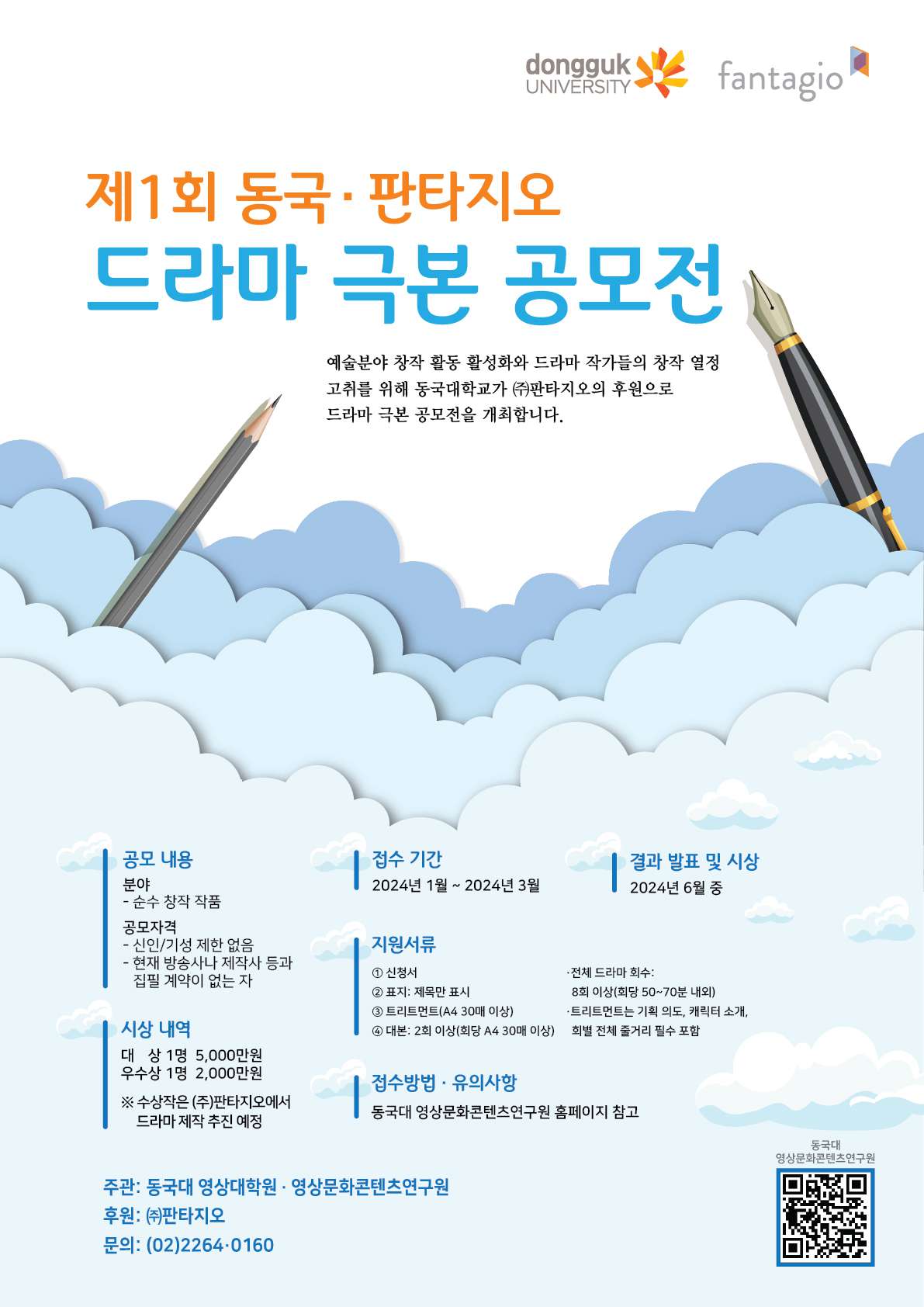 동국대학교 영상대학원과 영상문화콘텐츠연구원에서는 문학과 예술분야 창작 활동을 활성화하고 지원하여 드라마 작가들의 창작 열정 고취 및 관련 분야 발전을 도모하고 창조적 콘텐츠 발굴 및 확산을 목적으로 동국 · 판타지오 드라마 극본 공모전을 다음과 같이 개최하오니 많은 참여 부탁 드립니다. 수상작은 ㈜판타지오에서 드라마로 제작 추진 예정입니다.