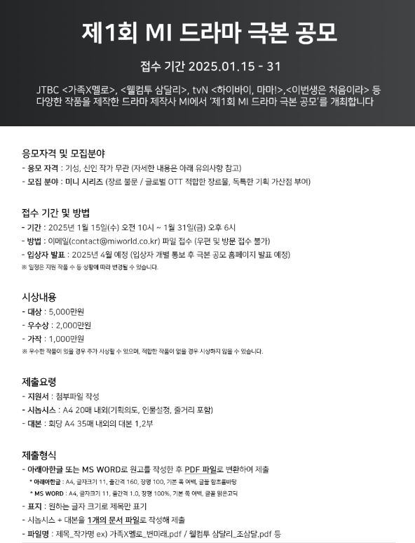 - 2025.4월 예정 (입상자 개별 통보 후 극본 공모 홈페이지 발표 예정)