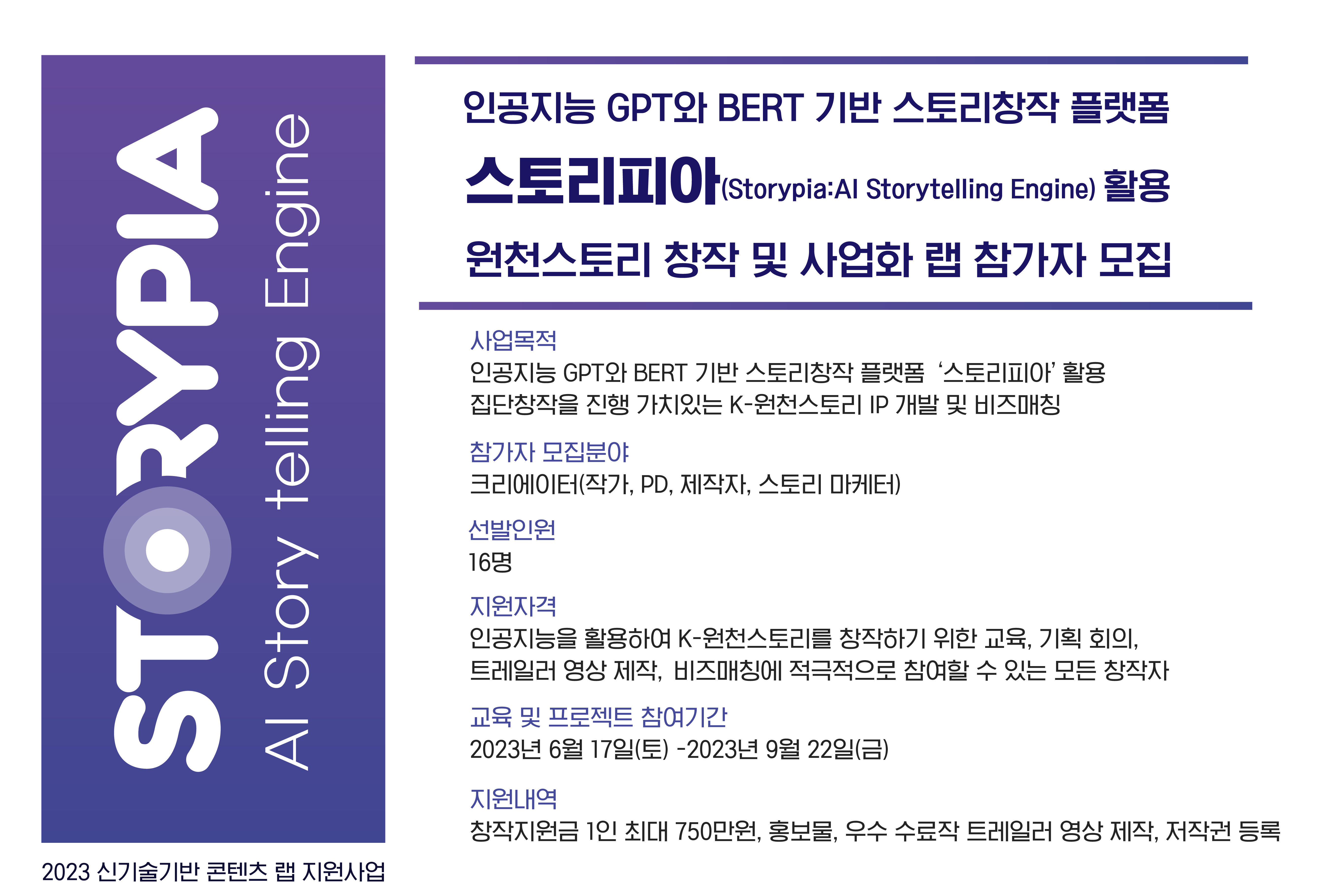 - 모집분야: 인공지능 기반 스토리 IP 크리에이터(작가, PD, 제작자, 마케터 등)